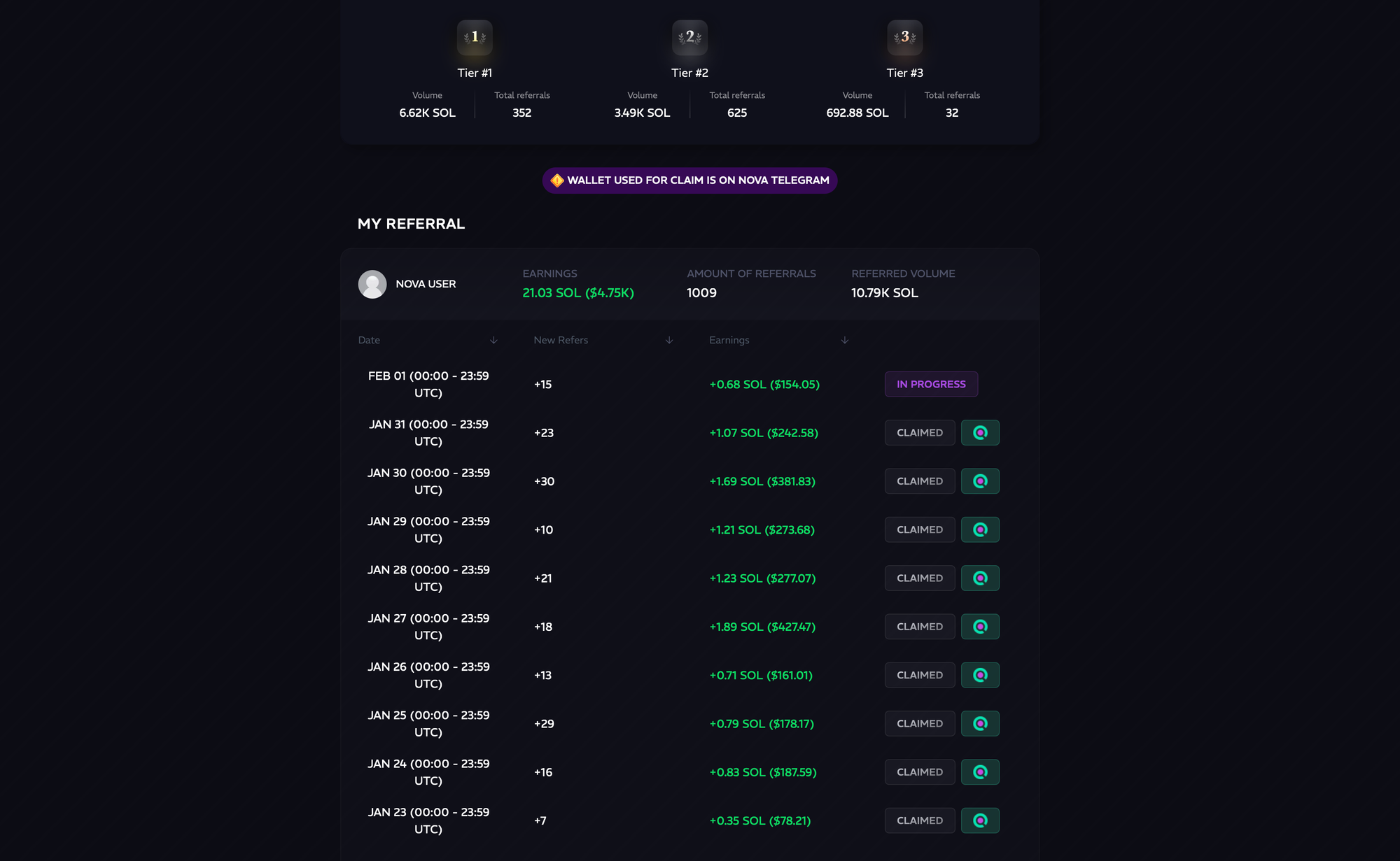 Nova’s referral program is organized into a 3-tier system, which allows users to earn rewards not only from their direct referrals but also from the extended network of referrals generated by those users. Here’s how each tier works in detail: